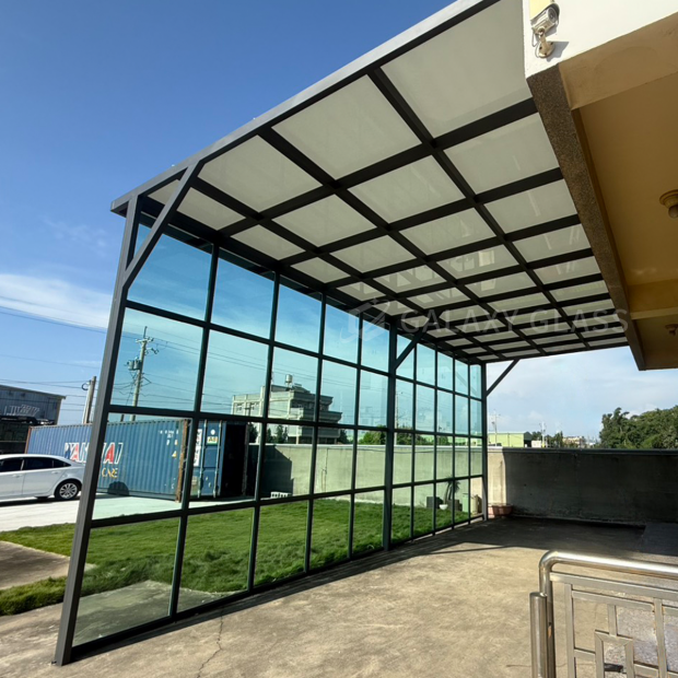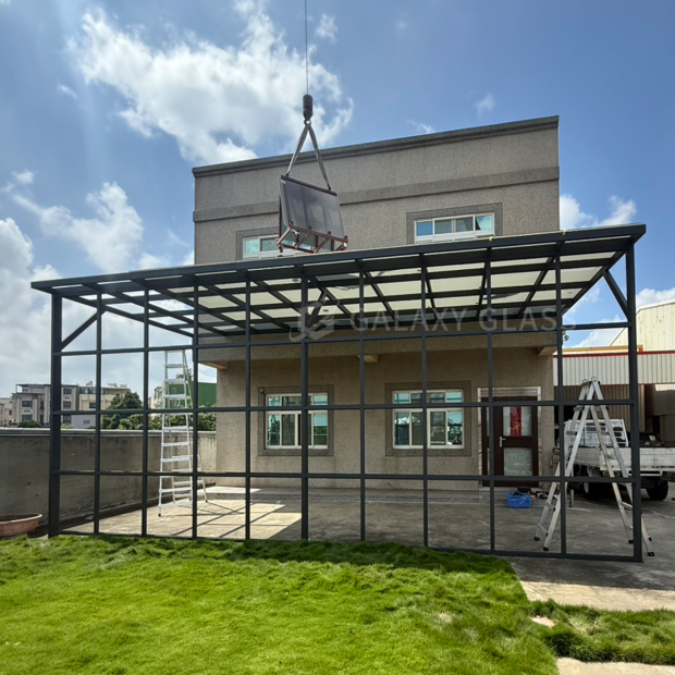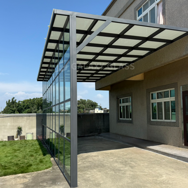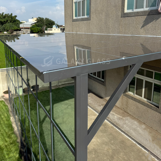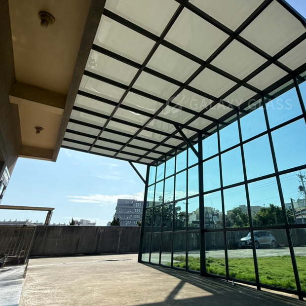 這次的設計結合了兩款玻璃,採光罩使用茶玻白膜隔熱系列』,立面玻璃牆使用了『綠玻隔熱系列』,為屋主打造全方位的防護與舒適 茶玻白膜採光罩:有效阻擋外界視線與烈日熱能,讓光線柔和不刺眼,空間清涼舒適 綠玻隔熱玻璃牆:隔絕雨水潑灑,減少毒熱陽光照射,同時保留通透視野 屋頂到立面的完整搭配,不僅外觀協調有層次,更在隔熱、防雨與隱私之間取得完美平衡 讓家在四季中都能保持涼爽又安心