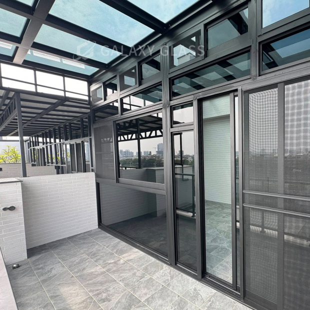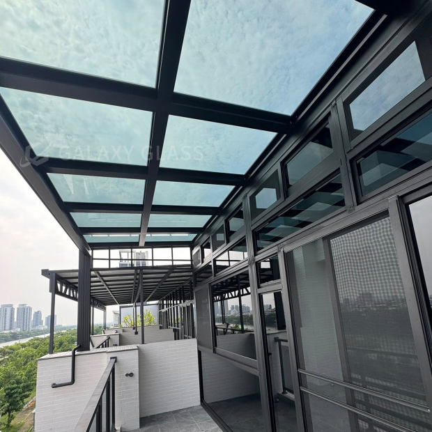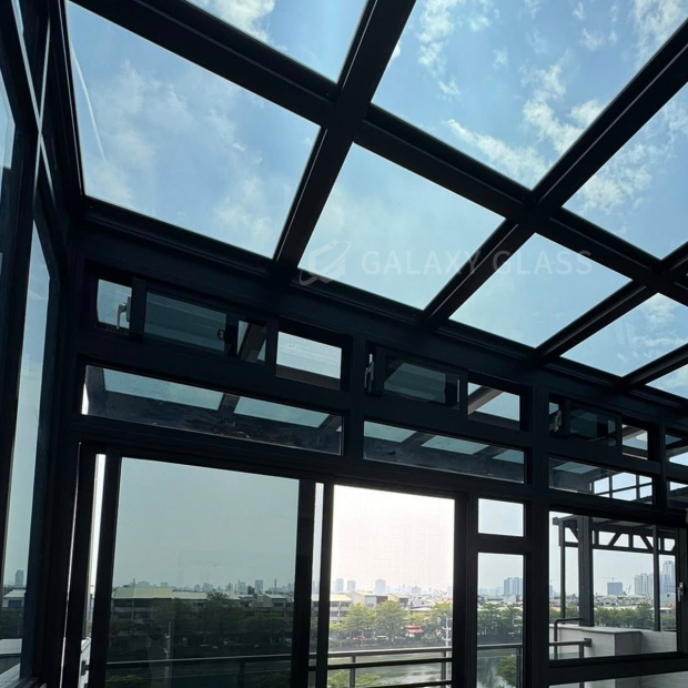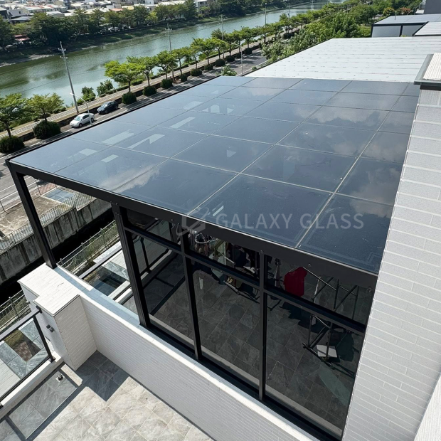 頂樓生活延伸空間,希望光線舒服、視覺通透,屋主選擇—天和黑玻隔熱膠合玻璃採光罩 天和玻璃黑玻採光罩特點 阻擋紫外線 透光柔和不刺眼 降低日照熱感 深色玻璃 × 線條結構,打造沉穩又不壓迫的視覺氛圍,享受光線帶來的自在感。