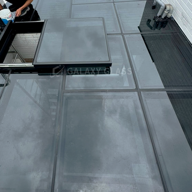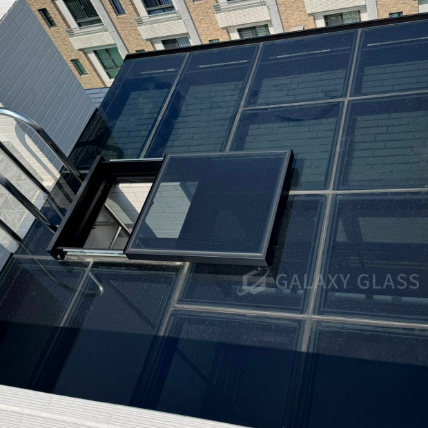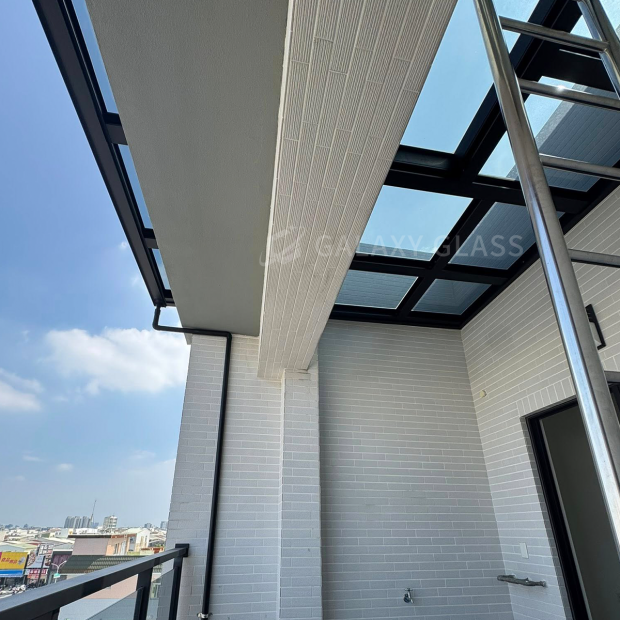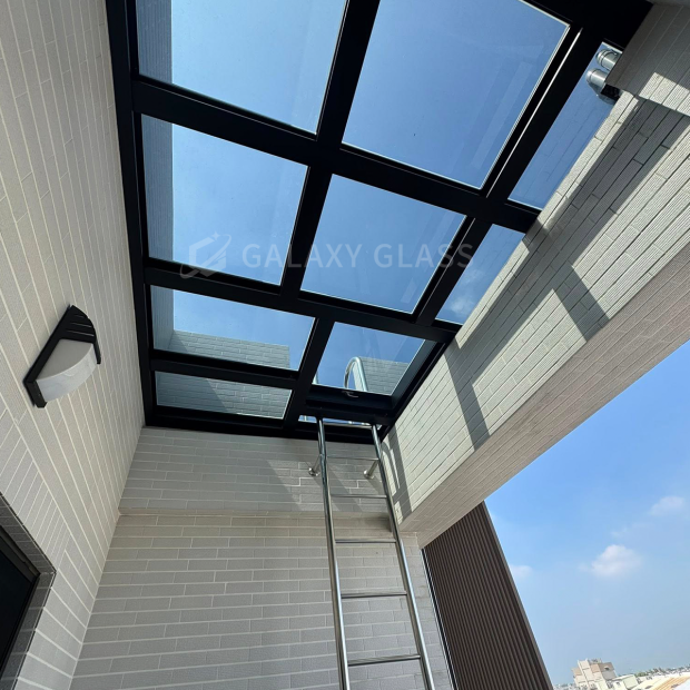 屋主在頂樓打造屬於自己的安靜角落,選用—天和黑玻隔熱膠合玻璃採光罩 保留剛剛好的光線,呈現沈穩低彩的視覺感受,讓頂樓多了份靜謐與質感 天和玻璃能降低熱感,阻擋紫外線,讓採光更加柔和不刺眼,都能享受舒適自在的光線環境。